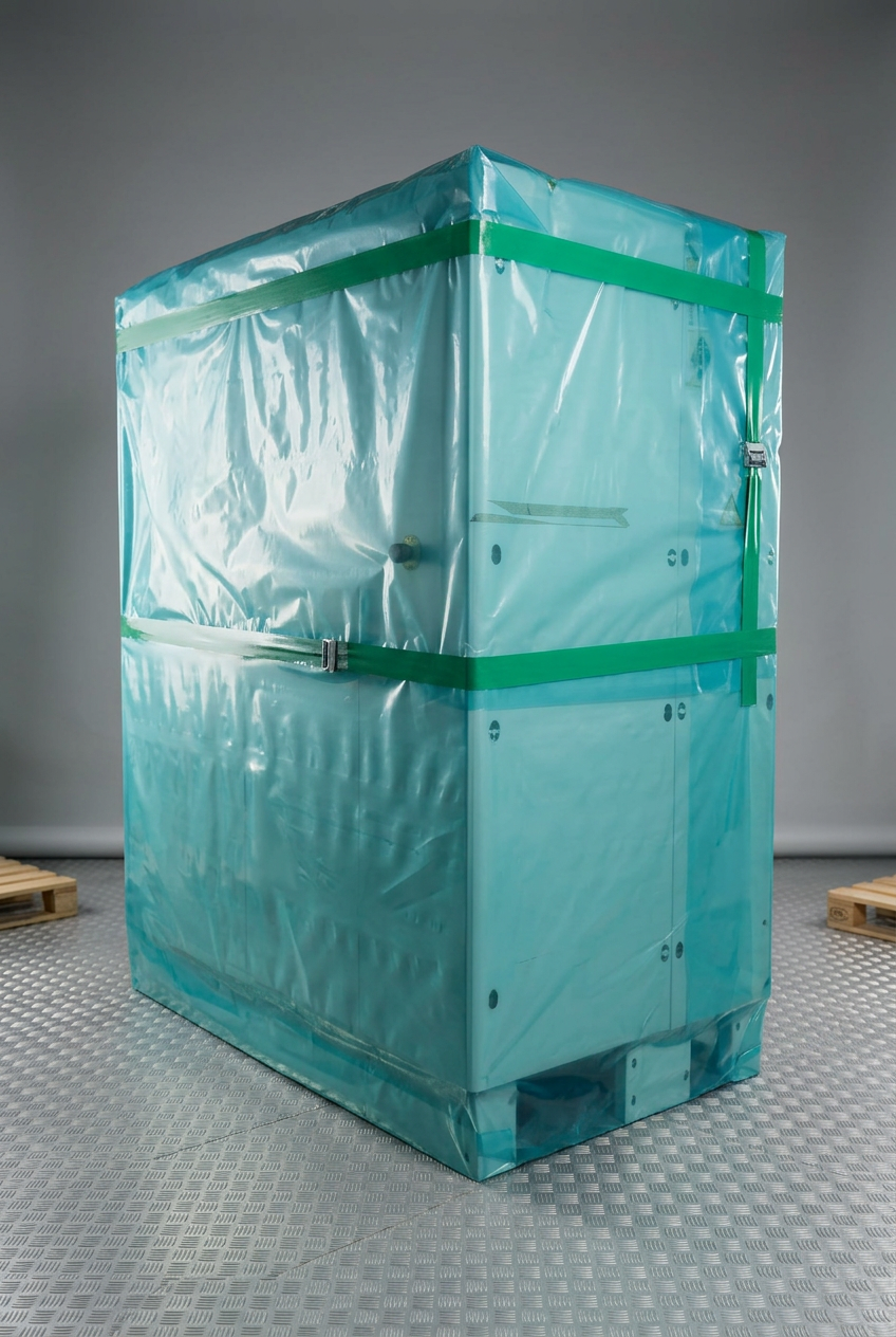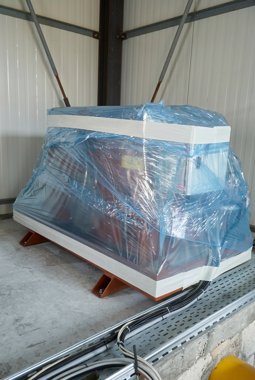 Opération Stopco (= Stop Corrosion) pour une machine industrielle préservée à l’aide de notre film VCI suite à un sinistre.