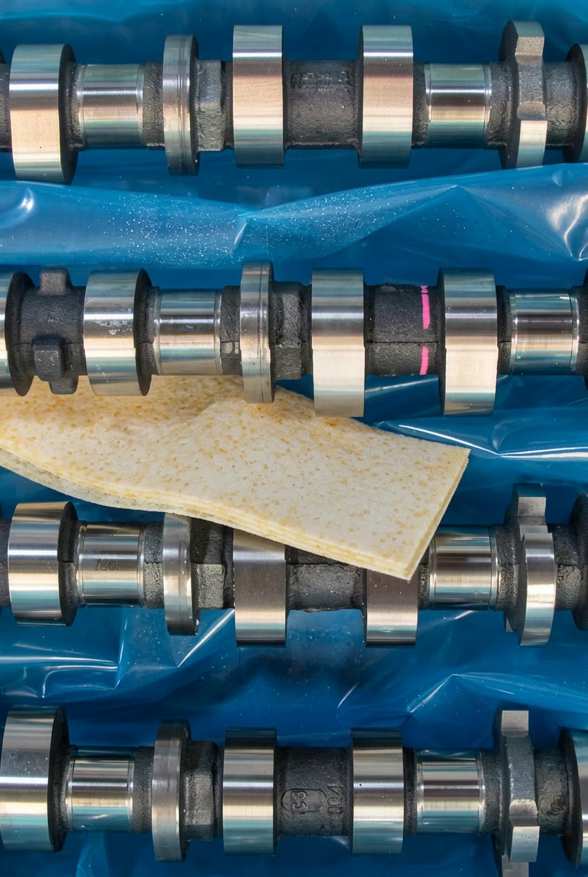 Protection d’arbres à came automobile pendant le transport. Produits utilisés: Housse VpCI-126, Emetteurs anticorrosion BioPad.