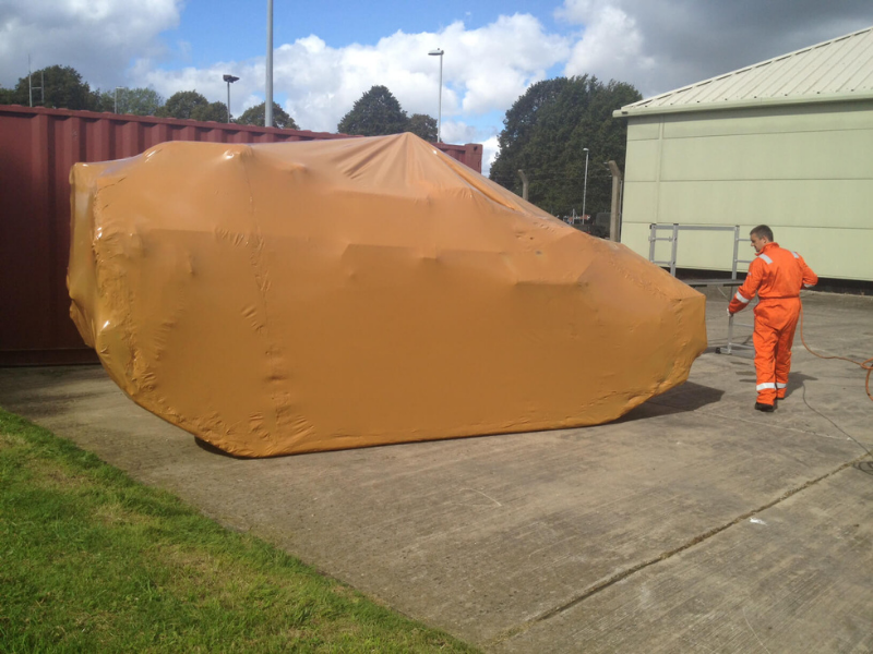 Tank de l’armée préservée contre la corrosion en phase de stockage. Produit utilisé: film VCI grade militaire Cortec Milcorr®.