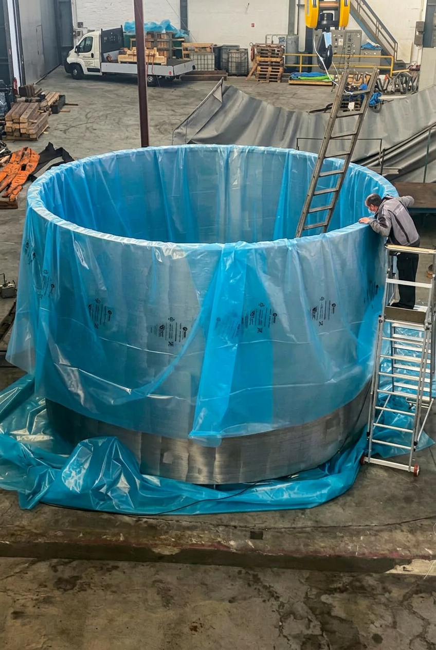 Protection anticorrosion d’ine virolle pour EDF par un client emballeur industriel chez un chaudronnier. Produit utilisé: housse VCI sur mesure.